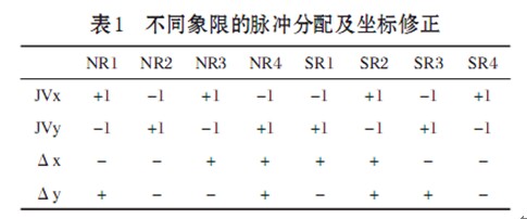 具體方法是, 設(shè)置JVx、 JVy為積分函數(shù)寄存器, JRx、 JRy為余數(shù)寄存器。在起點(diǎn)時(shí), JVx和Jvy分別寄存起始坐標(biāo)X0、 Y0,對(duì)于第一象限逆圓來說, 在插補(bǔ)過程中, JRy每溢出一個(gè)Δy脈沖, JVx應(yīng)該加1; JRx每溢出一個(gè)Δx脈沖, JVy應(yīng)減1。對(duì)于其他各種情況的DDA法圓弧插補(bǔ), JVx和Jvy是加1還是減1, 取決于動(dòng)點(diǎn)坐標(biāo)所在象限及圓弧走向[2]。