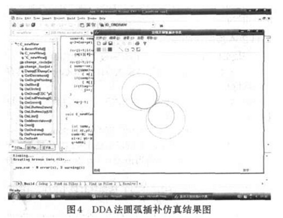 系統(tǒng)采用Visual C++6.0可視化開發(fā)工具編程, 實(shí)現(xiàn)了直線和圓弧插補(bǔ)算法。圓弧插補(bǔ)算法編譯運(yùn)行后的仿真結(jié)果如圖4所示。