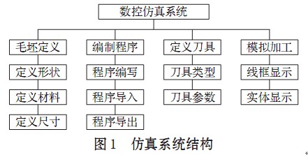 根據(jù)實際零件加工的操作順序, 數(shù)控加工仿真程序設(shè)置了零件定義、 程序調(diào)用、 刀具選擇等功能。系統(tǒng)的頂層功能結(jié)構(gòu)如圖1所示。