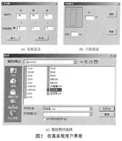 本仿真系統(tǒng)可通過兩個對話框定義毛坯的長L、 寬W、 高H、 工作坐標(biāo)系X、 Y、 Z以及刀具的規(guī)格直徑Ф、 對刀長度L用戶可通過一個文件對話窗體選擇數(shù)控程序PRO。具體的窗體界面如圖2所示。