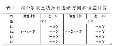 與前面進(jìn)行比較后發(fā)現(xiàn) 當(dāng)被插補(bǔ)直線處于不同象限時(shí) 其計(jì)算公式及處理過程完全一樣 僅僅是進(jìn)給方向不同而已 進(jìn)一步可總結(jié)出 L1 L2 L3 L4 的進(jìn)給方向如圖 6 和表 1 所示