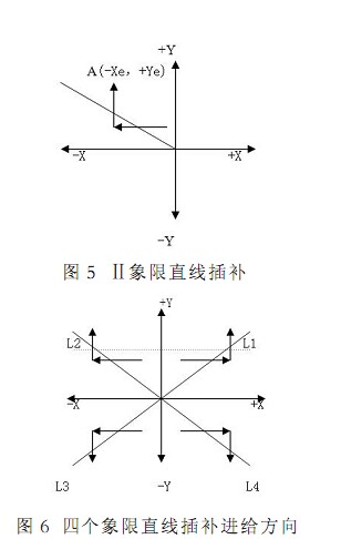如果直接利用圖 7 來插補(bǔ)四個(gè)坐標(biāo)軸直線時(shí) 將會(huì)造成較大的插補(bǔ)誤差 顯然不太理想 為此 可對(duì)這四種特殊情況進(jìn)行專門處理 即當(dāng)判出是插補(bǔ)四個(gè)坐標(biāo)軸直線時(shí) 可將(+X)軸直線插補(bǔ)歸入(+△X)進(jìn)給方向類 將(-X)軸直線插補(bǔ)歸入(-△X)進(jìn)給方向類 將(+Y)軸直線插補(bǔ)歸入(+△ Y)進(jìn)給方向類 將(-Y)軸直線插補(bǔ)歸入(-△Y)進(jìn)給方向類 這樣可將其插補(bǔ)誤差減小到零
