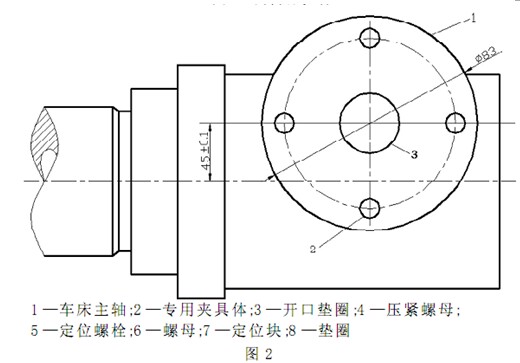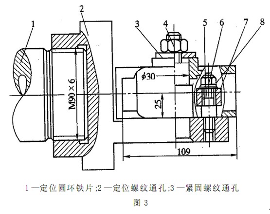 為保證該尺寸, 我們可在角鐵放置工件的基準(zhǔn)平面處( 如圖 1 -2箭頭所示) 鎖緊一高為 3 mm, 直徑為Φ 83 mm 的圓環(huán)鐵片,如圖 1 -3所示。該圓環(huán)鐵片與壓緊螺栓螺母、定位螺栓螺母( 如圖1 -2 的3 、 4 、5 、6 、7 、8所示) 一起緊固工件, 提高工件的定位精度, 并且防止工件在加工過程中偏移, 以保證加工精度。