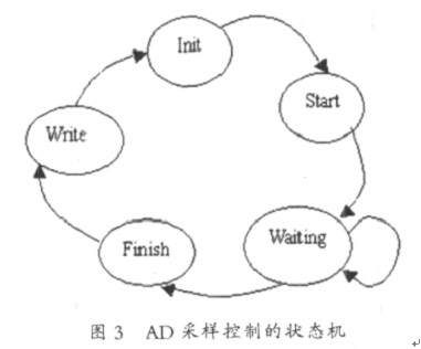 ( 2)AD采樣狀態機模塊: 完成 AD采樣控制, 將采到的數據存入 RAM中。狀態機的一個采樣周期設計為五個狀態: