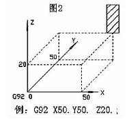指令中的 X- Y- Z- 是刀具上某一點 (一般是刀具基準點)在新建工件坐標系中的坐標值(圖 2)。由于用 G92(G50)指令建立的坐標系原點是根據刀具位置確定的, 當程序啟動時刀具處于機床不同位置, 工件坐標系原點的位置也隨之改變。所以用這種方式建立工件坐標系時, 編程人員需要在工序簡圖中標出刀具位置, 程序啟動前一定要把刀具移動到這個指定的位置。為了在加工下一工件時不致發生坐標原點改變, 程序結束時應當把刀具移回程序開始時的位置。