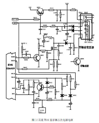升壓型電路的優(yōu)點(diǎn)是對(duì)主電源的元器件耐壓要求低,影響小,采用PWM 脈寬調(diào)制,原理上二次電源直接受控于脈寬。所以絕大多數(shù)數(shù)控彩顯都采用升壓型電路,在此我們也僅討論升壓型電路原理及故障檢修。具體結(jié)合三星公司生產(chǎn)的750S多頻數(shù)控彩顯進(jìn)行討論。