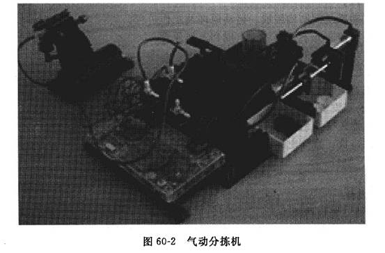 氣動分揀機(jī)(見圖60-2)用于分揀黑色和白色的物體。該設(shè)備由氣源、分揀機(jī)和智能接口板組成,共使用了2個電動機(jī)分別驅(qū)動空氣壓縮機(jī)和曲柄滑塊機(jī)構(gòu);3個電磁閥控制分揀撥叉的動作;1個光電開關(guān)用于檢測物體的顏色;1個限位開關(guān)用來確定分揀撥叉的位置。