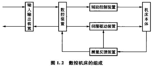 數(shù)控機(jī)床一般由輸人輸出裝置、數(shù)控裝置、輔助控制裝置、伺服驅(qū)動(dòng)裝置、測(cè)量反饋裝置和機(jī)床本體等部分組成,如圖1. 2所示。